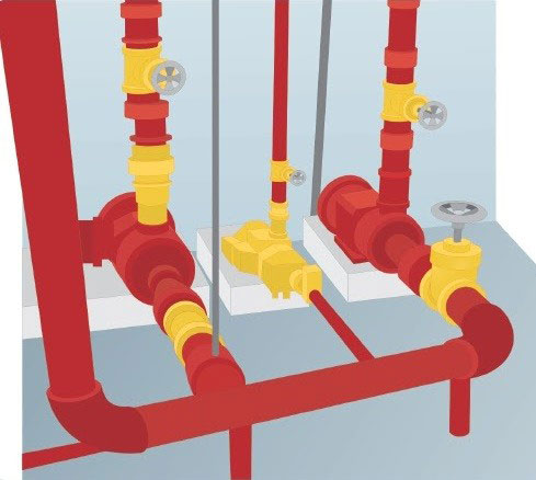 Os sistemas prédiais apresentam: tomada com registros e uniões de engate rápido, mangueiras de combate à incêndio , esguichos, chaves storz onde está construído o reservatório de água da própria edificação.