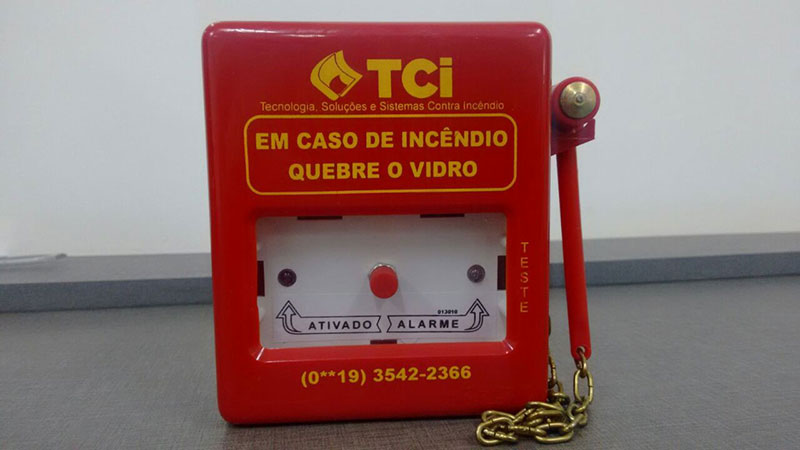- Acionadores / Botoeiras de alarme de incêndio: botão acionador para funcionamento do sistema de alarme.